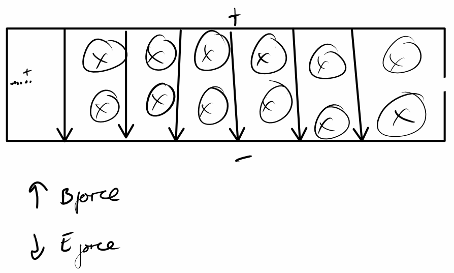 In a mass spectrometer, charged particles with the selected velocity will pass through the window and undergo circular motion, circling upwards with varying radii depending on mass. Different numbers of these charged particles will interact with different parts of the detector, and their abundances are proportional to generated current due to electron flow.